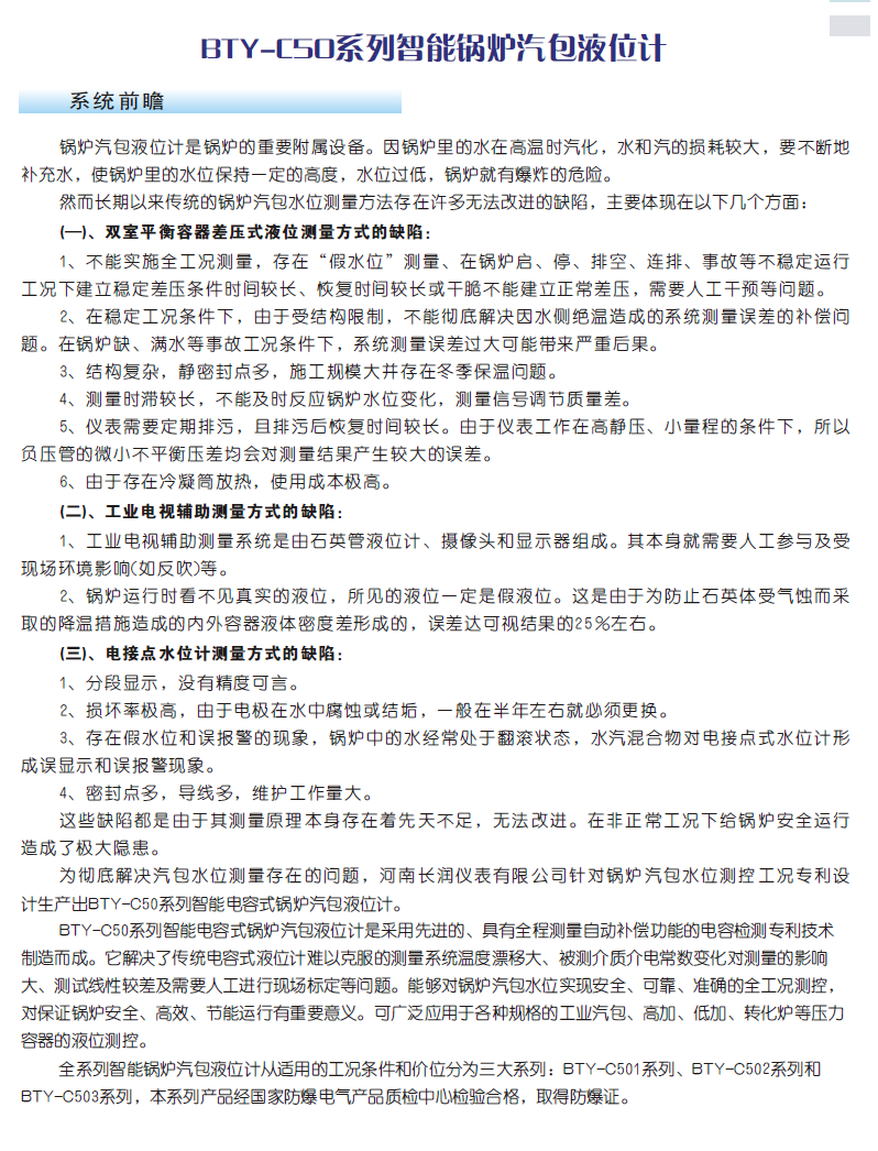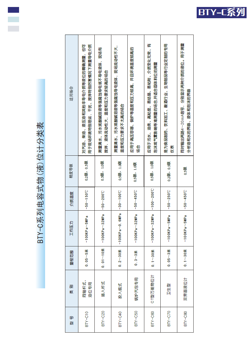 BTY-C系列電容式物位計采用一種基于全數(shù)字化電容測量方法,并運(yùn)用多參數(shù)補(bǔ)償技術(shù),研制出一系列高精度的物位計,已經(jīng)在多個領(lǐng)域試用成功。例如安裝在機(jī)動車輛上的電容式油位傳感器,在各種強(qiáng)腐蝕、高溫、劇毒、爆炸等高危險場合使用的電容式高溫高壓液位計,能自動適應(yīng)各種介質(zhì)的高精度CT型物位計。這些物位計在有關(guān)行業(yè)試用,得到了有關(guān)行家的一致好評。