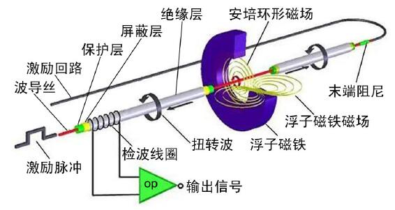 磁致伸縮液位計主要由電子部件、磁致伸縮波導(dǎo)絲、浮子等部分組成。測量時,電子部件產(chǎn)生一個電流“激勵”脈沖,該脈沖電流以光速沿波導(dǎo)絲向下運行,并在波導(dǎo)絲周圍形成周向安培環(huán)形磁場。當(dāng)激勵脈沖電流產(chǎn)生的環(huán)形磁場與浮子內(nèi)永磁鐵產(chǎn)生的偏置磁場相遇時,浮子周圍的磁場發(fā)生改變,從而使得由磁致伸縮材料做成的波導(dǎo)絲在浮子所在的位置產(chǎn)生一個感應(yīng)扭轉(zhuǎn)波脈沖,該扭轉(zhuǎn)波以聲速由產(chǎn)生點向波導(dǎo)絲的兩端傳播,傳向末端的扭轉(zhuǎn)波被阻尼器件吸收,傳向激勵端的信號則被檢波裝置接收,并由電子部件測量出脈沖電流與扭轉(zhuǎn)波的時間差,再乘以扭轉(zhuǎn)波在波導(dǎo)絲中的傳播速度(固定量為2800m/s),即可計算出浮子產(chǎn)生扭轉(zhuǎn)波的位置與測量基準(zhǔn)點間的距離,也就是液面的位置。磁致伸縮液位計傳感器原理見下圖。